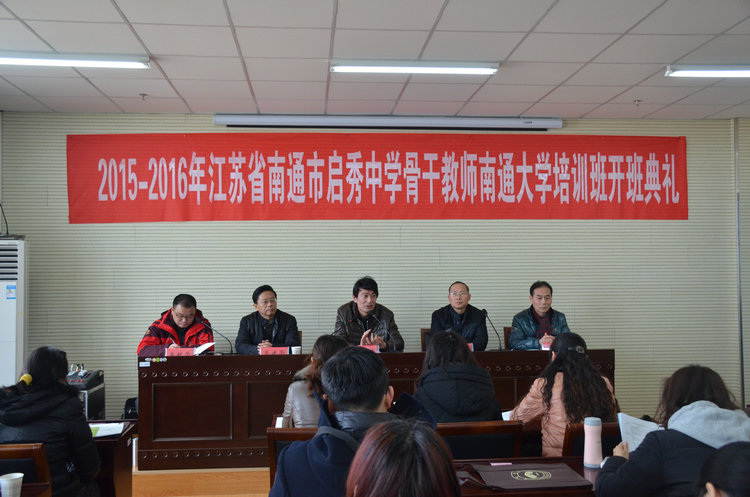 2016年1月13日,2015~2016年江苏省南通市启秀中学骨干教师培训班开班,学院党总支书记陈炜、启秀中学校长杨志冲,副校长马建华、教研室主任彭文明和启秀中学46位骨干教师出席了开班典礼,开班典礼由项目负责人孟献华副教授主持。