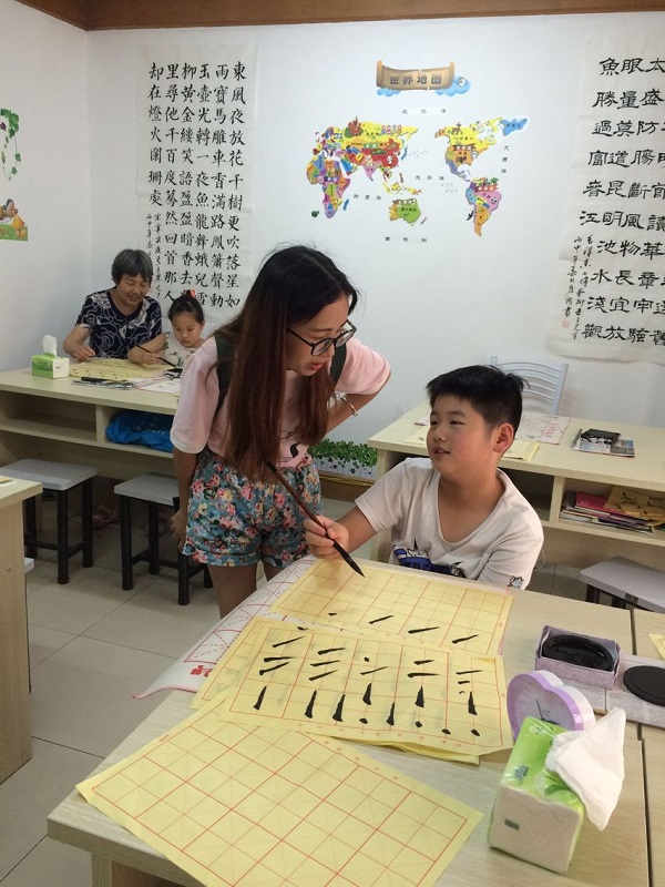 2016年7月5日下午,污漫 书法研习社“翰墨书香·书法传情”暑期社会实践小分队成员全体成员在指导老师陈燕飞的带领下,来到学田社区育贤教育机构辅导小学生学习书法。
