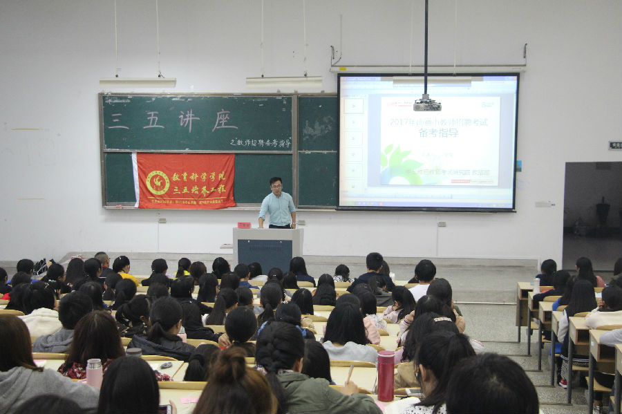 10月26日下午两点,污漫 特邀中公名师王堂堂老师在9号教学楼201教室举办以“教师招聘备考指导”为主题的三五讲座,共有200多名同学参加此次讲座。
