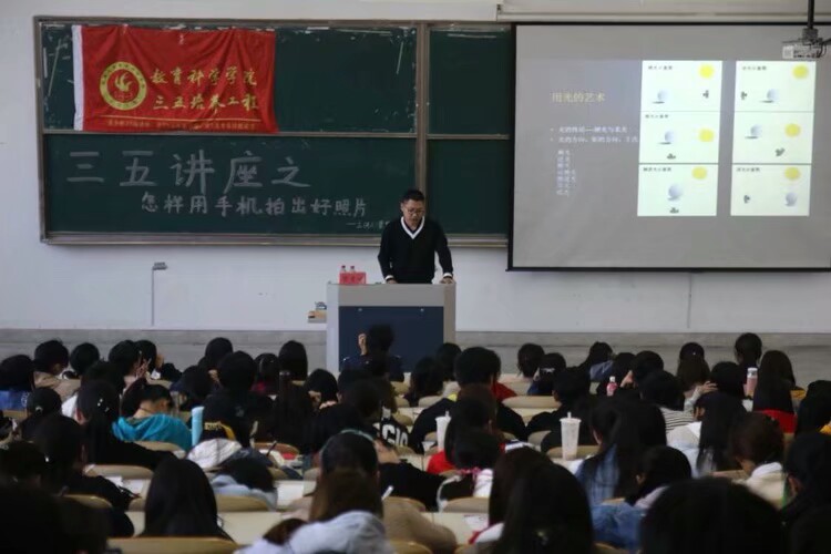 2018年3月28日下午,污漫 在9号楼302成功举办了以“怎样用手机拍出好照片”为主题的三五讲座。此次讲座特别邀请知名摄影师管楚迪主讲,杨晓新老师主持讲座,来自教科院的200余名本科生到场参与了此次讲座。