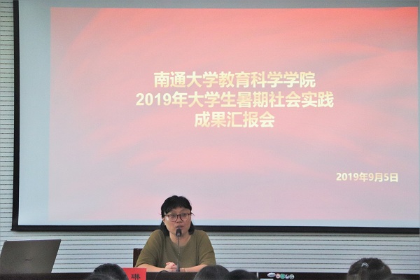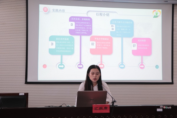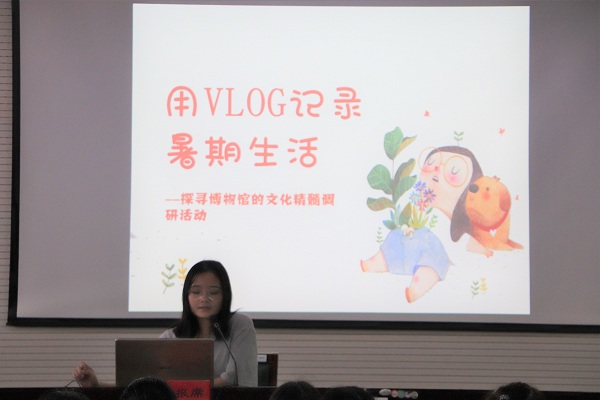 墨香逸雅爱心服务团的代表夏文倩着重介绍了团队实践的过程,对实践的日程分布,教学内容作了明确的讲解。扶苗团队分两部分进行汇报,分别由施沈珏和所方琳负责,主要介绍了团队历史、活动内容等方面,特别是西部计划部分,突出了“教育关爱 扶贫攻坚”的主题。情系村小爱心支教团的负责人王娅楠用各类活动照向我们展示了暑期实践的内容,又用投稿截图,优秀申报书截图,微信聊天截图向参会人员展示了实践的优秀成果,总结了实践感想。最后,曾婉怡作为Vlog记录暑期生活实践小分队的负责人,用一个简短的视频展示了团队暑期社会实践的主要内容和自身总结。