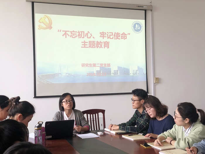10月12日下午,研究生第二党支部在18号教学楼1016会议室举行“不忘初心、牢记使命”的主题教育专题学习。党支部书记蔡婧主持会议。