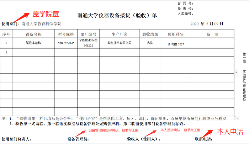 2、最后需要申请人带上网上申请流程单(从采购记录里面下载并打印出来)、验收单(详见附件1)和购物发票这三件宝贝到固定资产处设备管理科(综合楼223,刘国镜)打印入库单。