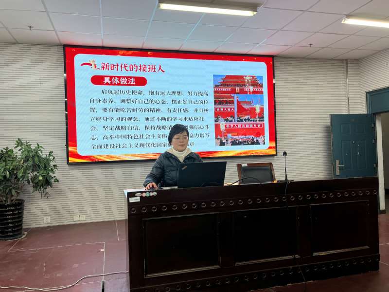 朱斐斐老师就“新时代应该怎么做”这一主题给新时代的接班人提出了宝贵建议。她说作为新时代的接班人,我们要肩负起历史使命,抱有远大理想、努力提高自身素养、调整好自己的心态、摆正好自己的位置,要有能吃苦耐劳的精神、有责任感、并且树立终身学习的观念,学习宣传贯彻党的二十大精神是当前和今后一个时期的首要政治任务,全体同学务必继续以伟大建党精神滋养自己,做到真学真信真用,学懂弄通做实,推动党的二十大精神进一步入脑入心、走深走实、见行见效,为实现中华民族伟大复兴贡献自己的青春力量。