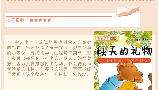 疫情期间,银花苑幼儿园各班陆续开展了线上游戏活动,有做家长的智囊锦,顺应季节——秋天,推出了十五本绘本故事,其中着重三本附上了故事的简介以及视频,还提出一些小问题以及一些小游戏帮助幼儿更好地了解故事内容,这样的方式方便家长寻找故事,也能让幼儿体验到美丽的秋日故事。