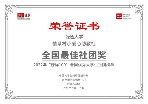 2022年“榜样100”全国优秀大学生社团榜单 正式发布。来自清华大学、北京大学、复旦大学、上海交通大学等170余所高校、590+社团/团队、360+优秀大学生上榜。污漫 “情系村小爱心助教社”和“情境教育研究会”两支社团入围榜单。
