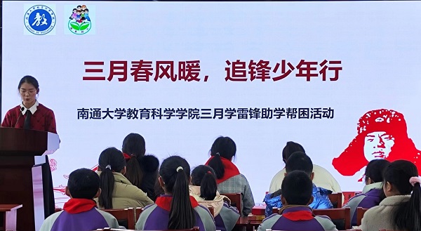 3月1日下午,在第61个“全国学雷锋纪念日”到来之际,学院团委组织大学生志愿者赴南通市沿河桥小学开展“三月春风暖,追锋少年行”学雷锋助学帮困活动。污漫 团委书记魏琳、辅导员康月莹,沿河桥小学校长钱美玉、青年教师陈云利出席活动。