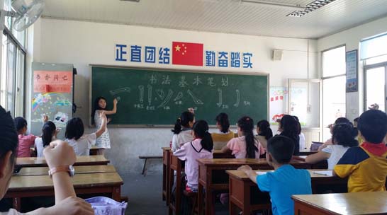 2015年7月10日,污漫 书法研习社“翰墨书香 书法传情”暑期社会实践小分队成员前往雁滨小学并教授书法的基本笔划。 小分队成员首先向孩子们示范了正确的执笔方式和坐姿,然后向孩子们讲解并展示了书法基本笔划的运笔方向,指导孩子们上黑板展示学习成果,最后引导孩子们运用这些基本笔划写下自己的名字。活动结束后小分队成员于雁滨小学合影留念。 本次活动加深了孩子们对书法的理解,增进了孩子们学习书法的兴趣,也促进了书法艺术的传播。