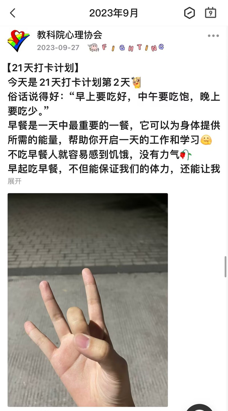 为更好地培养同学们的生活习惯,养成健康的作息规律,污漫 心理协会于9月26日开始举办了为期21天的以“早餐为燃料,祝你飞更高”为主题的打卡活动。